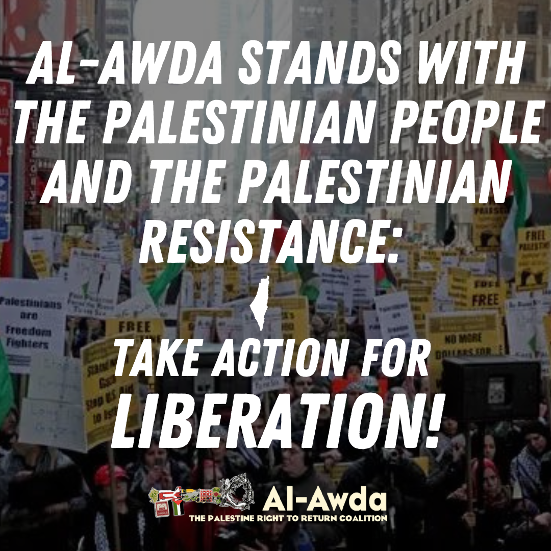We, the Al-Awda Palestine Right to Return Coalition, firmly stand in unwavering support of the Palestinian resistance, and we fervently urge our Palestinian people to mobilize in the face of colonial genocide. This ongoing struggle, born from a deep-seated yearning for justice and liberation, demands our resolute solidarity. It is a powerful response to decades of unspeakable atrocities, relentless oppression, and the suffocating blockade that has imprisoned the Gaza Strip and refused its population – mostly Palestinian refugees – their right to return. The Israeli occupation regime, the perpetrator of these heinous acts, has rained down a deluge of violence upon Palestinian towns and cities, while sacred sites are desecrated with impunity. Families have been torn apart, their lives shattered under the iron grip of an occupying force. To turn a blind eye to these atrocities is to forsake our moral compass and betray the very essence of our shared humanity. The Palestinian resistance, through their brave actions, are forging a path to bring the ongoing Nakba to an end. Yet, in the face of such adversity, the Palestinian people rise as an indomitable force, their spirit unyielding, their determination unbreakable. They demand their inalienable right to self-determination, liberation and return, their unwavering cry for freedom echoing through the annals of history. We must never underestimate the power of an oppressed and occupied people yearning to breathe the air of liberty. As people of conscience struggling for justice and liberation, it is our solemn duty to heed this call, to champion the cause of justice, and to stand shoulder to shoulder with the Palestinian resistance. We must cast aside the shackles of complacency and embrace the urgency of their struggle. Together, we shall forge a path towards justice, return and liberation for Palestine, from the river to the sea. Let our voices resound with unwavering conviction, shaking the foundations of U.S. government complicity in these crimes, including nearly $4 billion in annual military aid to the Zionist colonizer. Let us rally the international community, igniting an unquenchable fire of solidarity. For it is in unity that we find strength, and it is through collective action that we shall dismantle the walls of oppression. The time for action is upon us. Let us march forward, unwavering in our support, unwavering in our commitment to justice. Together, we shall unleash a tidal wave of transformation, where the Palestinian people rise victorious over colonialism, reclaiming their freedom, claiming their right to return, exercising their right to live in dignity in a liberated Palestine, free of imperialism, colonialism, racism and Zionism. We demand the United States government and the international community end their complicity in the ongoing crimes against the Palestinian people, a people living under colonial occupation and denied their right to return home for over 75 years. Palestinians in exile and diaspora have been illegally denied their homeland, including the over 70% of Palestinians in Gaza who are themselves Palestinian refugees. The Palestinian people possess an inherent right to resist occupation, a fundamental right that must be upheld and defended. We further demand the United States government immediately end all aid and support to the Israeli occupation regime. Every year, our tax dollars fund $4 billion dollars in weaponry to arm the occupier against the Palestinian people. This complicity in war crimes and genocide must immediately end. We further demand that the United States cease its efforts to impose “normalization” projects on the Arab region through the so-called “Abraham Accords” and other attempts to legitimize Zionist colonialism in the region through bribery and illegitimate imperialist sanctions. The Palestinian resistance has exposed the bankruptcy of this project, and it must come to an end once and for all. The United States has been part and parcel of the blockade of Gaza for over 16 years, imposing a siege on the Palestinian people that was meant to kill the resistance. However, the resistance has not been killed – it has flourished despite the brutality of the open-air prison imposed upon the Palestinians of Gaza. We demand not only the end of the crimes, but reparations to the Palestinian people for the reconstruction and development of Gaza and all of Palestine. We will return! From the river to the sea, Palestine will be free!